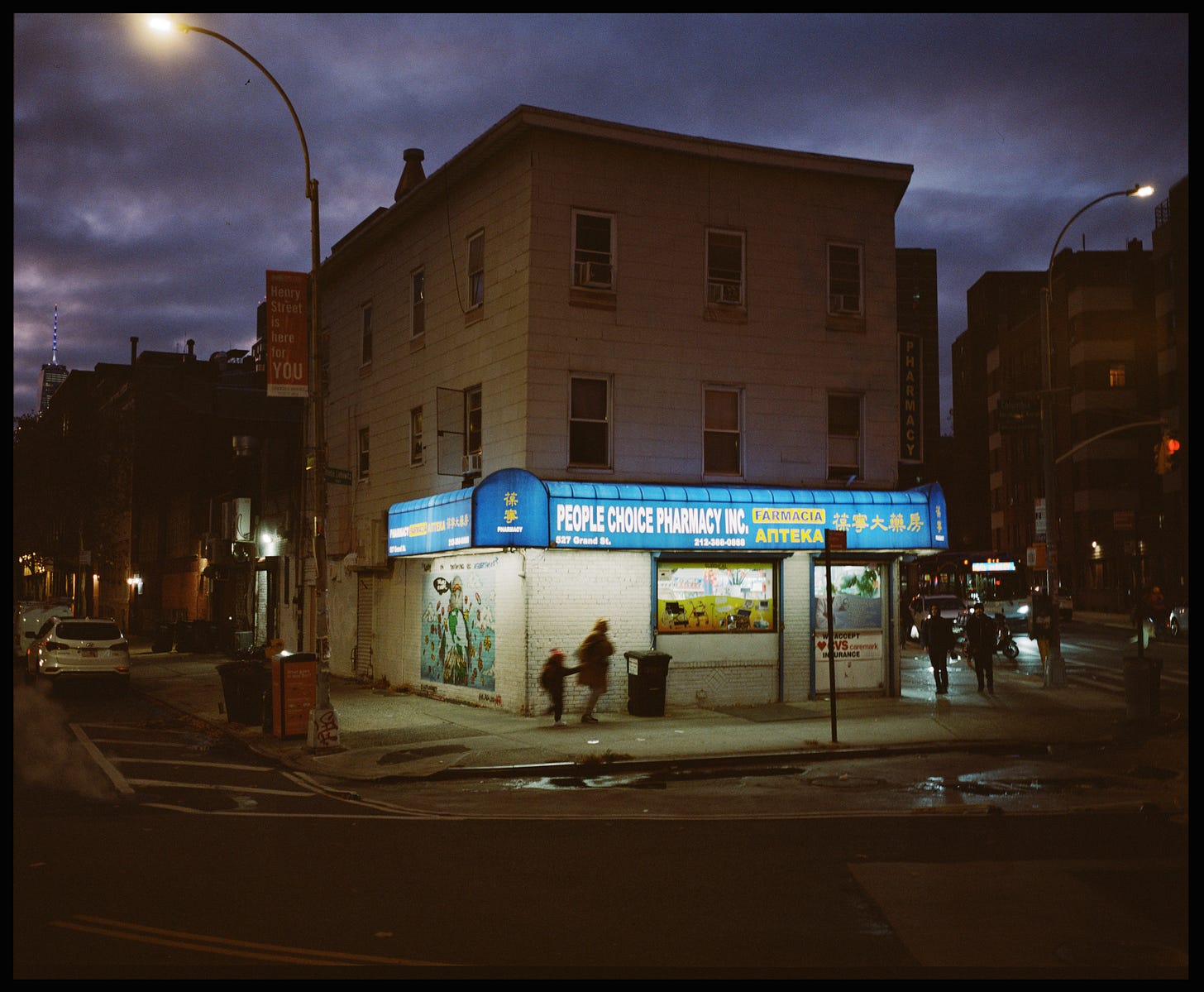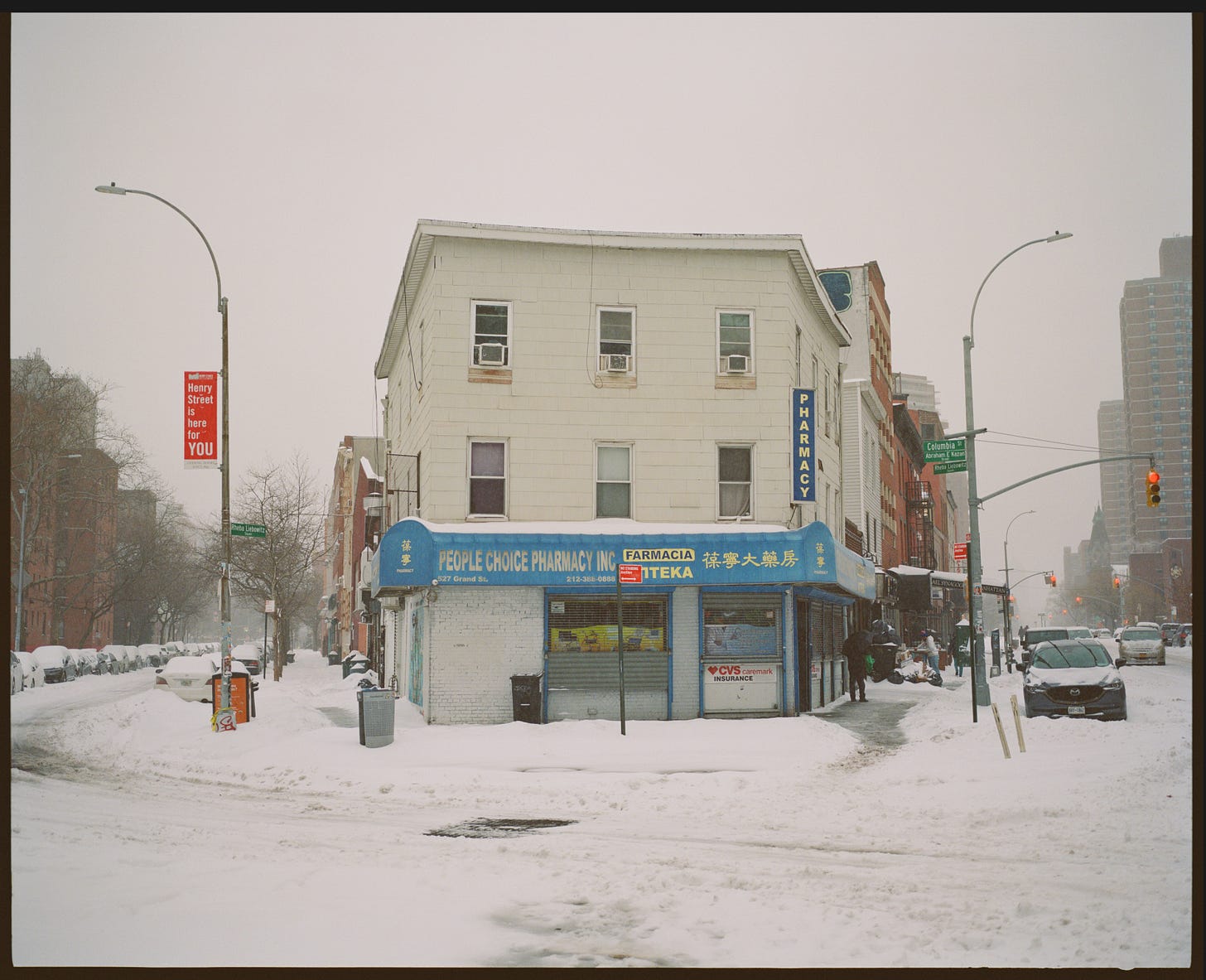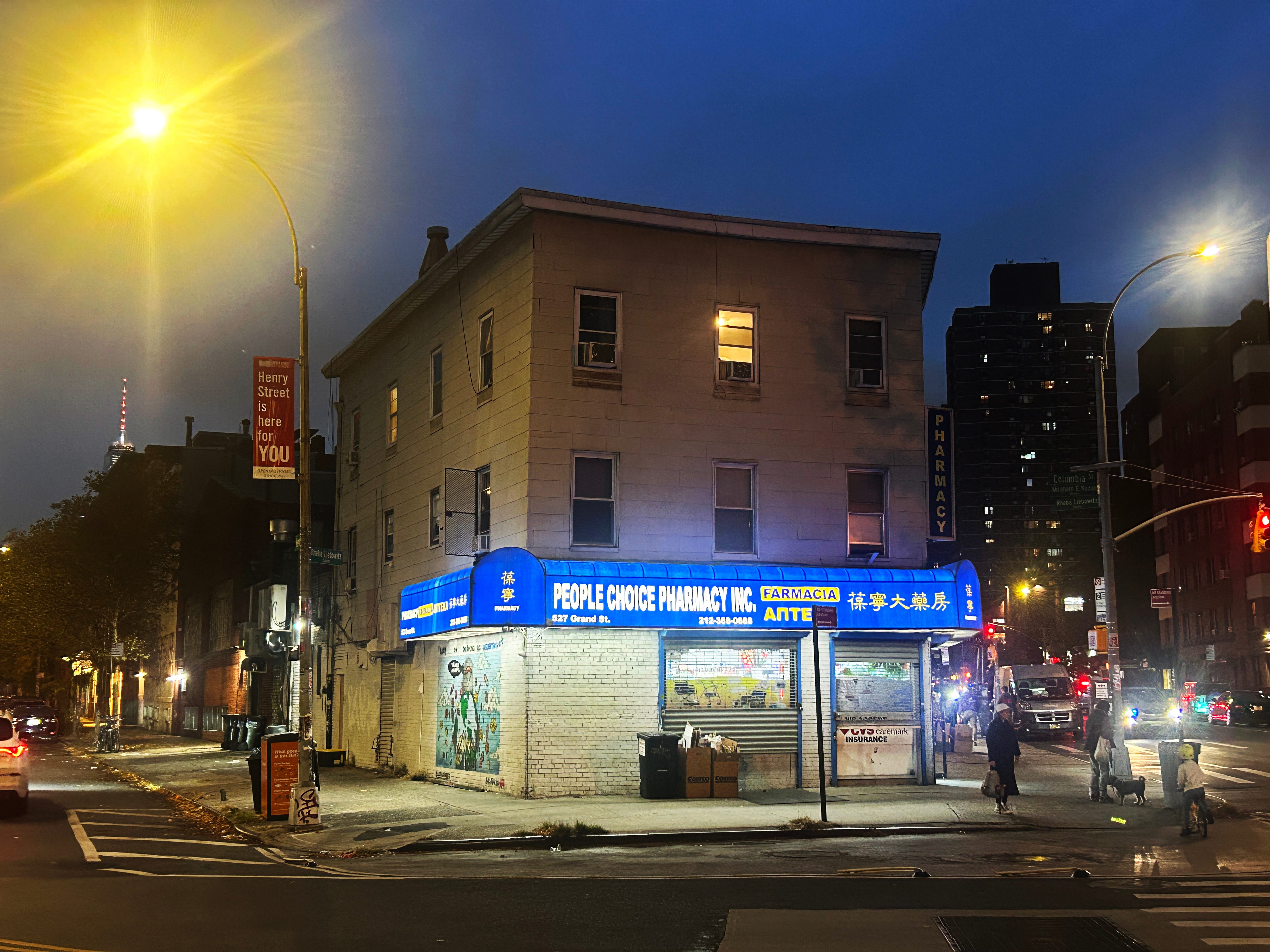 It sits on a narrow, angled corner where Henry Street and Grand meet on the Lower East Side of Manhattan—a kind of sad little Flatiron building, but one I like very much. I’ve always been drawn to these odd corners; they force interesting architectural choices, like this funny little trapezoid of a building. I pass it once a week when I take my daughter to dance class, and I started photographing it as I walked by. Eventually, I began going out of my way to visit it with a camera. Here are a few of my favorites.